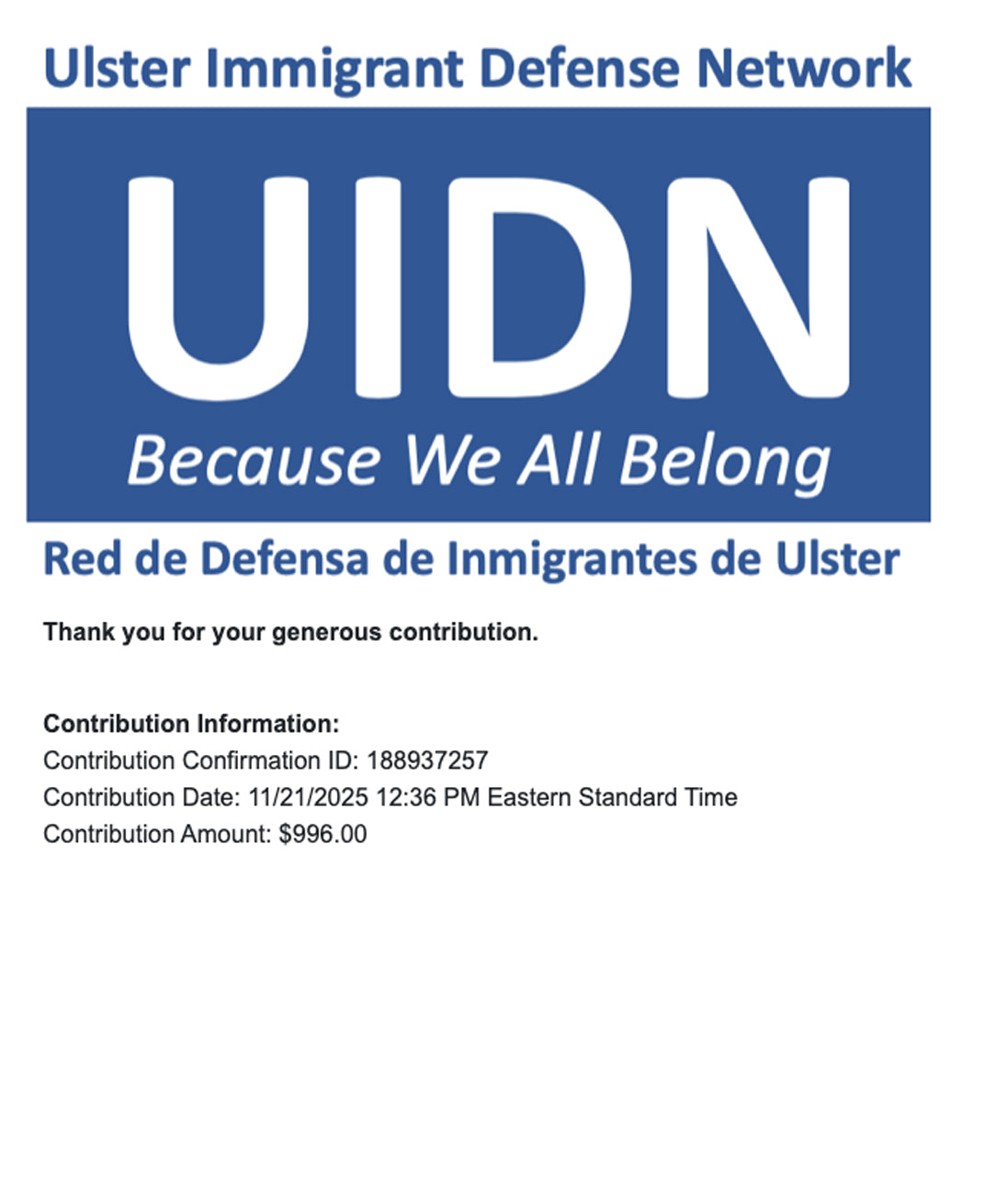 5" x 3.5" glossy vinyl water resistant sticker to support Ulster Immigrant Defense Network